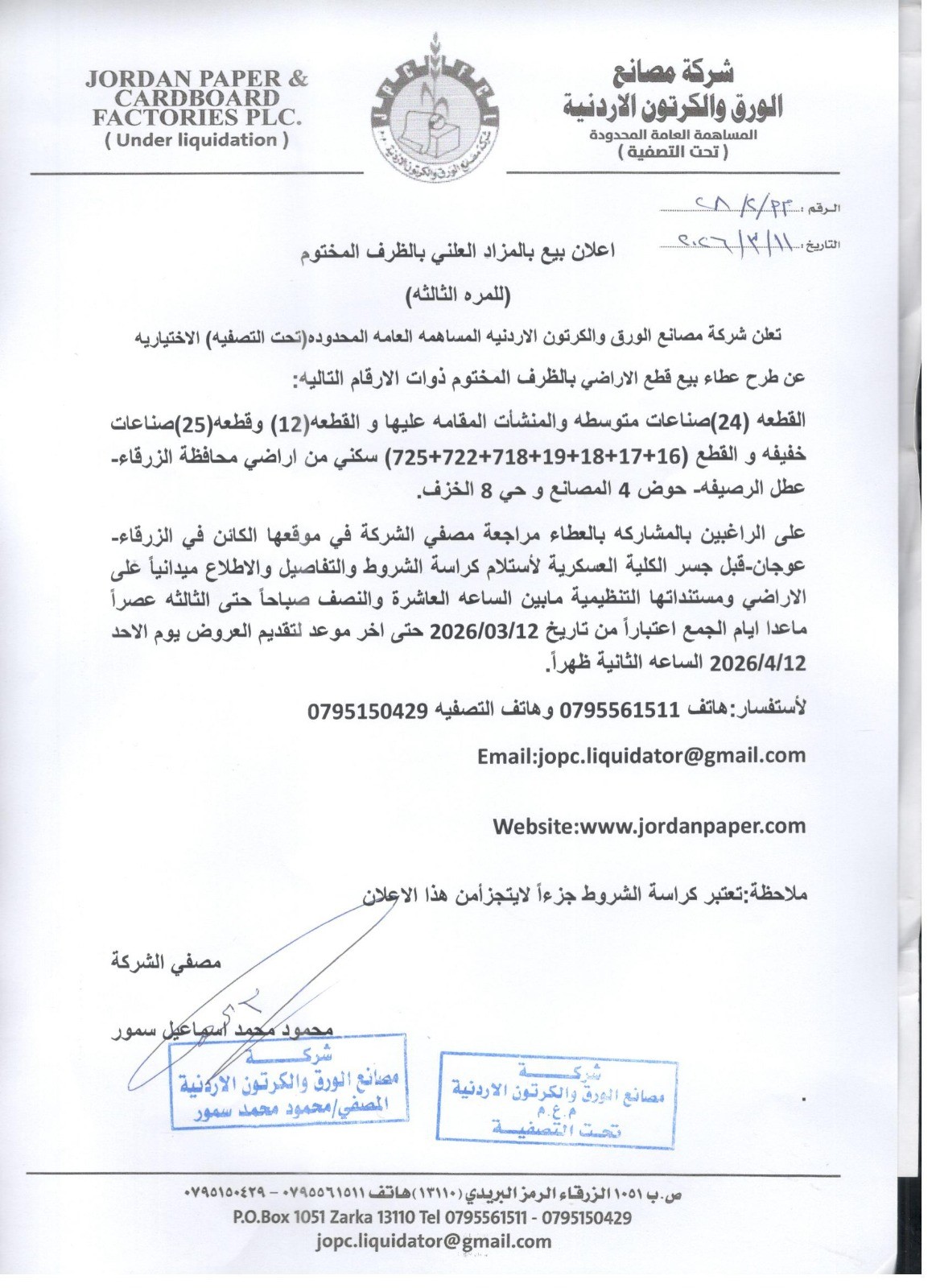 اعلان بيع بالمزاد العلني بالظرف المختوم ( للمرة الثالثة ) بتاريخ 11-3-2026