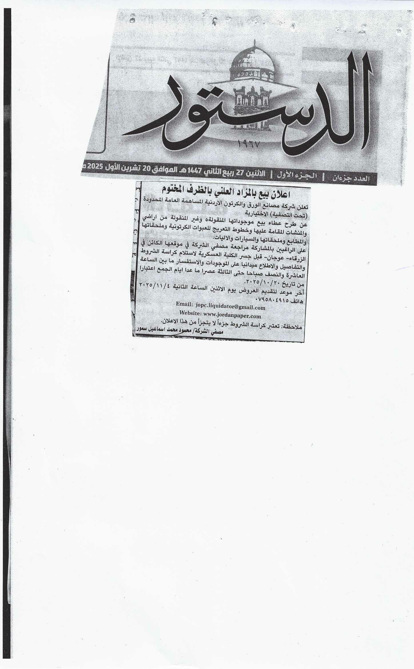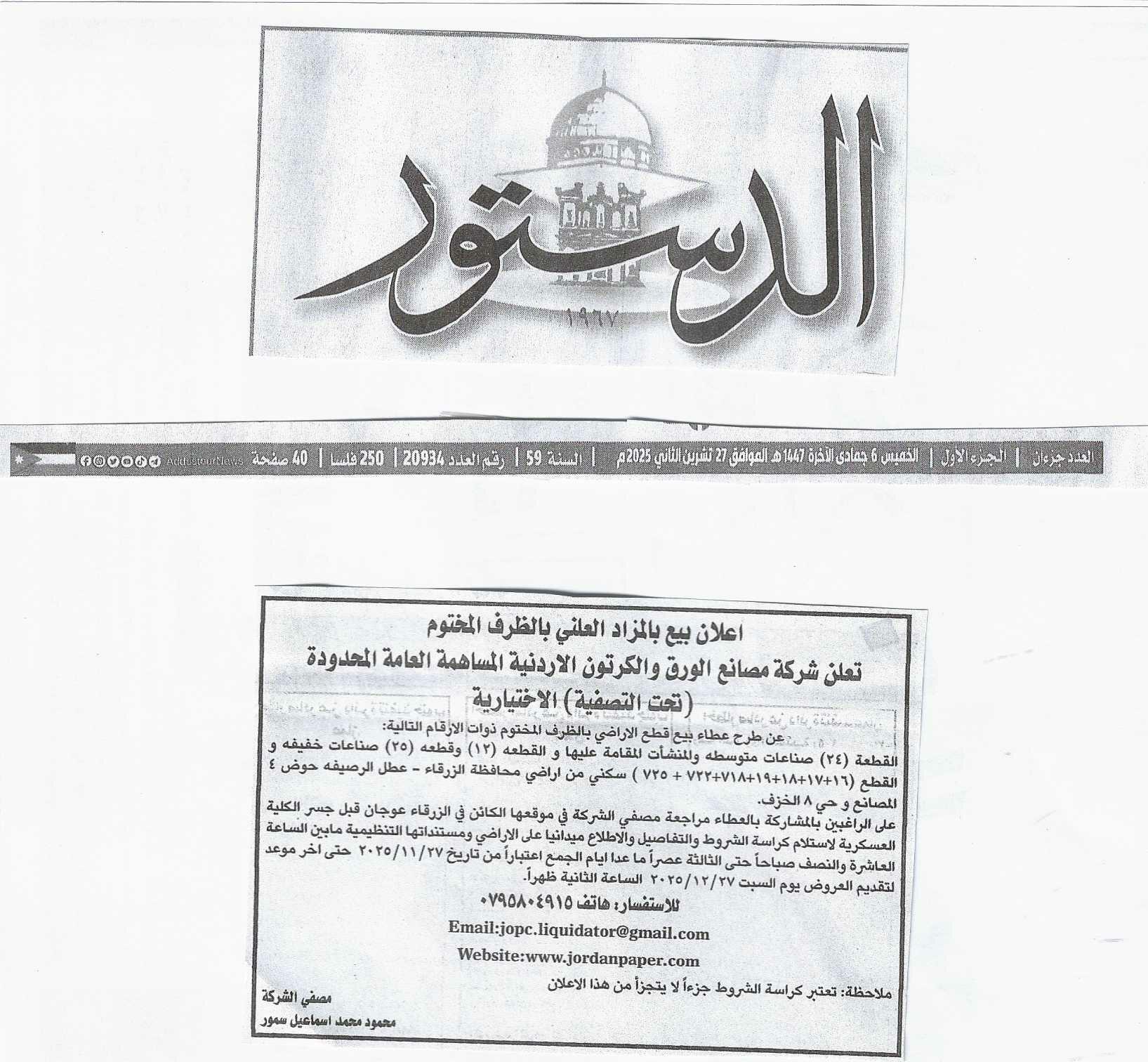 اعلان بيع بالمزاد العلني بالظرف المختوم في جريدة الدستور ( رقم العدد 20934 ) بتاريخ 27/11/2025
