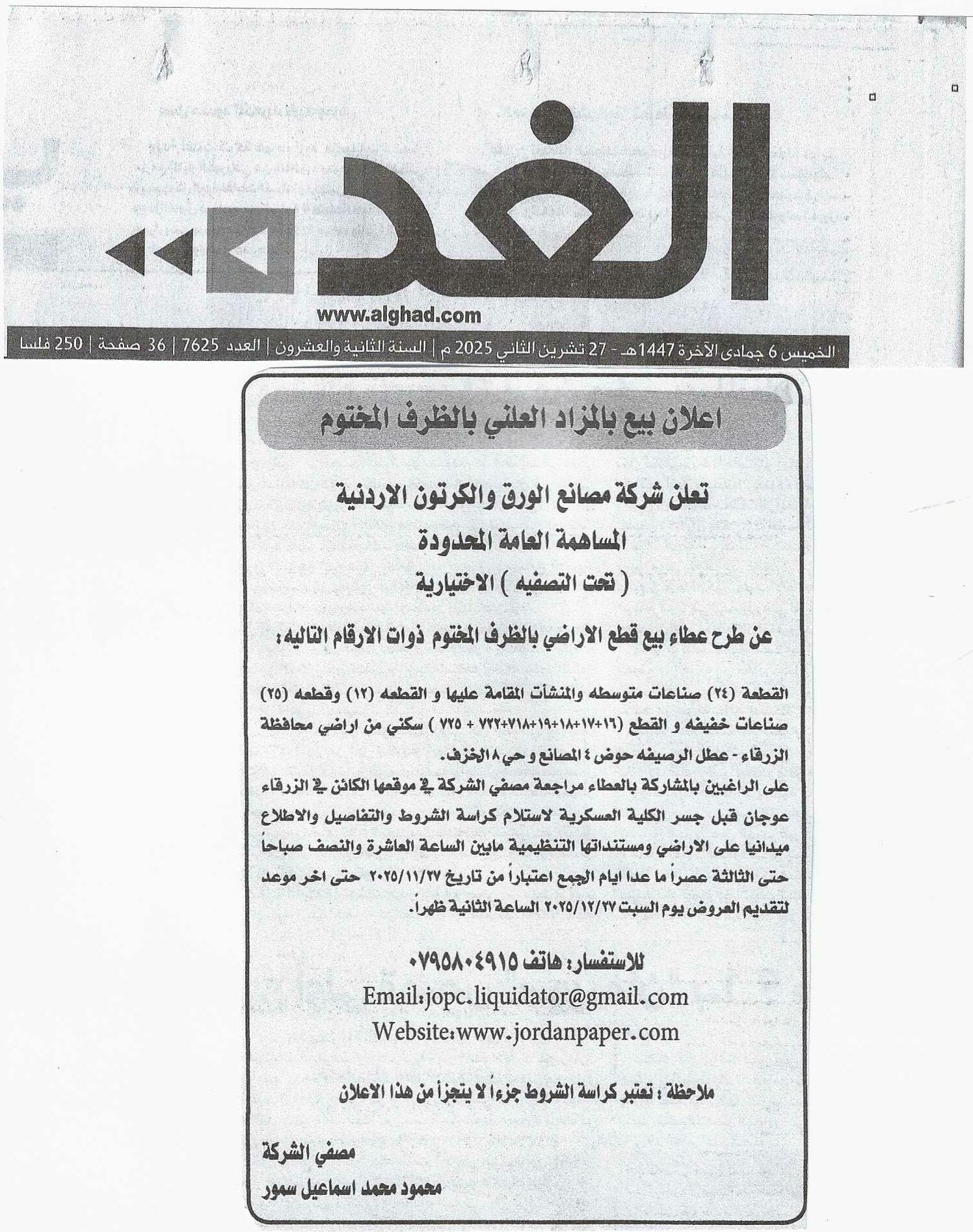 27/11/2025 اعلان بيع بالمزاد العلني بالظرف المختوم في جريدةالغد ( رقم العدد 7625) بتاريخ
